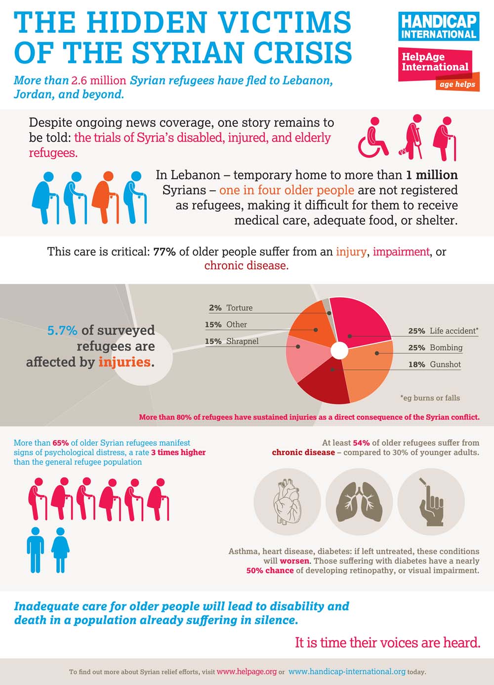 In partnership with Handicap International, we conducted research into the experiences and needs of Syrian refugees in Lebanon and Jordan. By interviewing over 3,000 older refugees, we found they have been affected disproportionately by the conditions they faced fleeing Syria and are struggling to cope with their new lives.